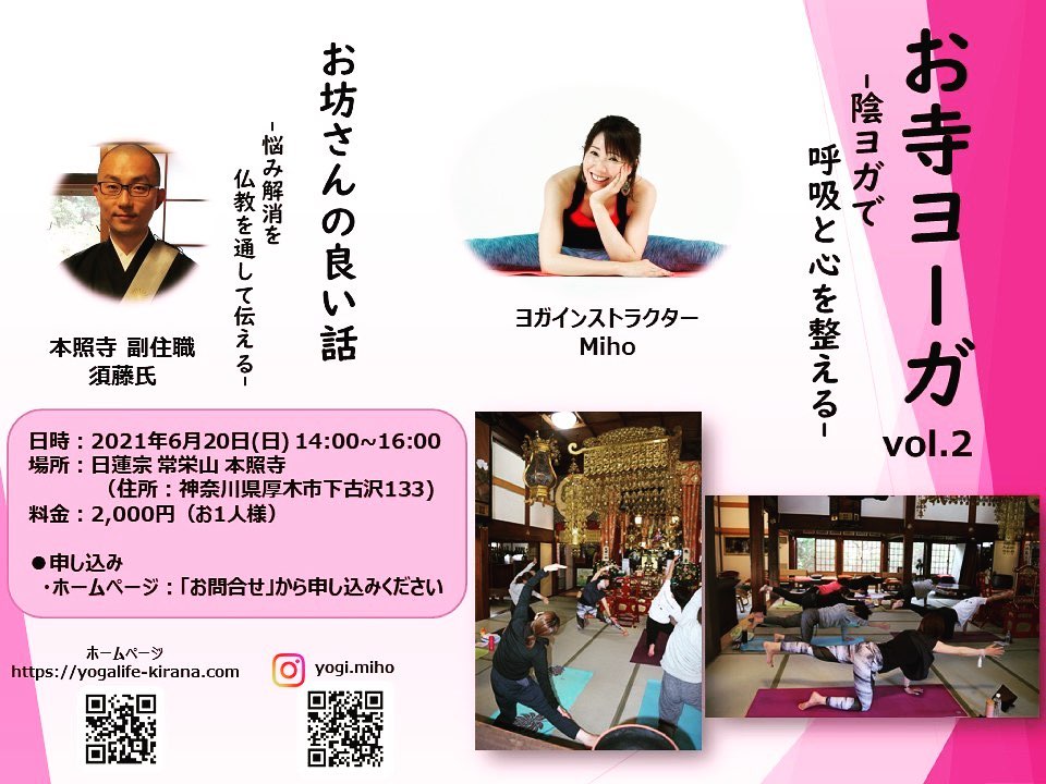 6/20(日)の『お寺ヨーガ&お坊さんのお話』の告知ポスターが出来上がりました!ご予約はInstagramのプロフィールにあるホームページよりお願い致しますm(_ _)mお寺という清らかな聖地でヨーガとお坊さんのお話の体験をしてみませんか変化の多い今の時代にこそ必要な心構えと身体作り是非一緒に楽しいひとときを過ごしましょう