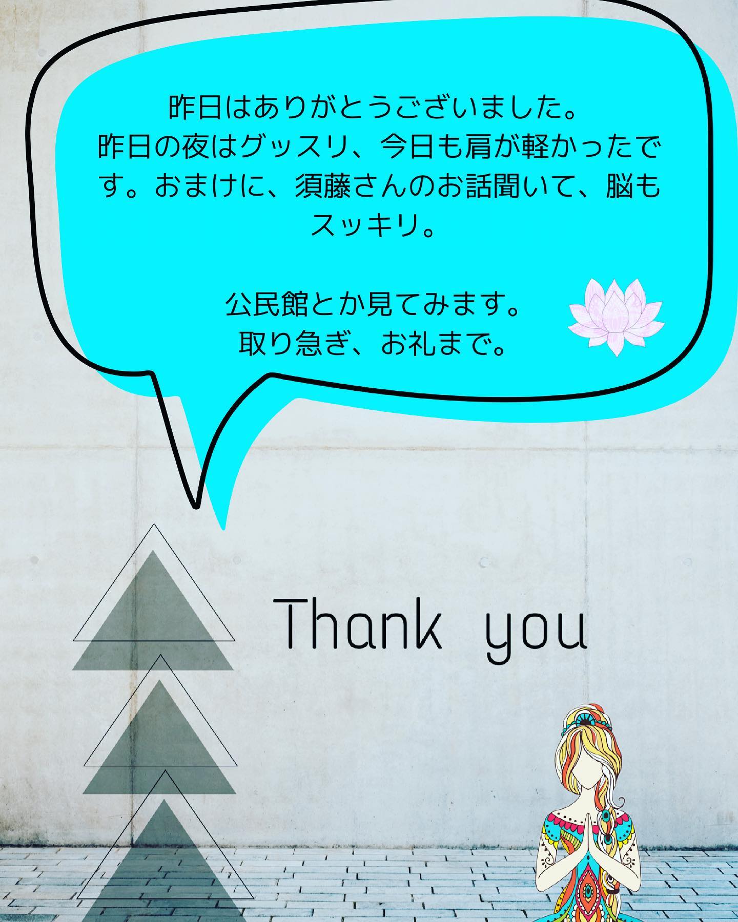 感謝の言葉、心から嬉しく思います私自身、ヨガインストラクターをしていて、お客様のヨガやレッスンの様子に対してのご感想は1番の喜びですこれからもヨガにも人間的にも日々精進していきたいと思います。
