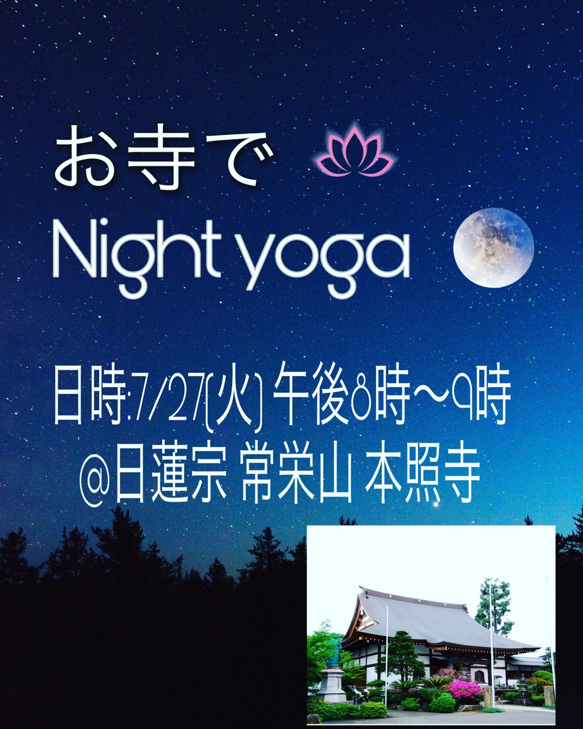 [再開のご連絡] 7/27 Night yoga@本照寺に決まりました!! ヨガ X Facebook LINE コピー 2021.07.122021.07.13 中止とご連絡した7月のNight yogaは、本照寺さんのご厚意で場所を貸して頂くことになりました 🙂 ご興味があるからは是非申込ください。 申込は問い合わせからお願いします!!