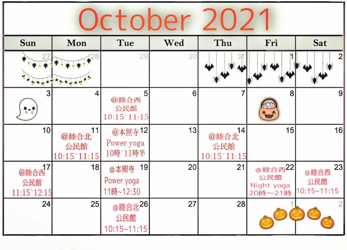 10月のレッスン予定表 ヨガ X Facebook LINE コピー 2021.10.03 10月のスケジュールです🎃 場所と日時が日によって異なりますので、ご確認をよろしくお願いします^^ View this post on Instagram MIHO Amemiya ∞心と体に寄り添うヨガ∞(@yogi.miho)がシェアした投稿