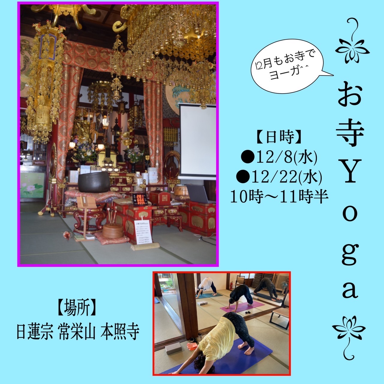 皆さんのお気持ちを副住職さんに伝えて、ご相談したところ、12/8、22、追加でお寺ヨーガレッスンを快く受け入れてくださり、開催致す運びとなりました^^